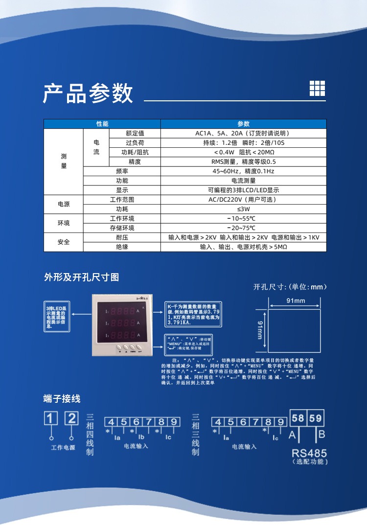 厂家直销智能电力仪表三相电流表液晶数码91*91开孔尺寸选配RS485