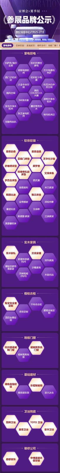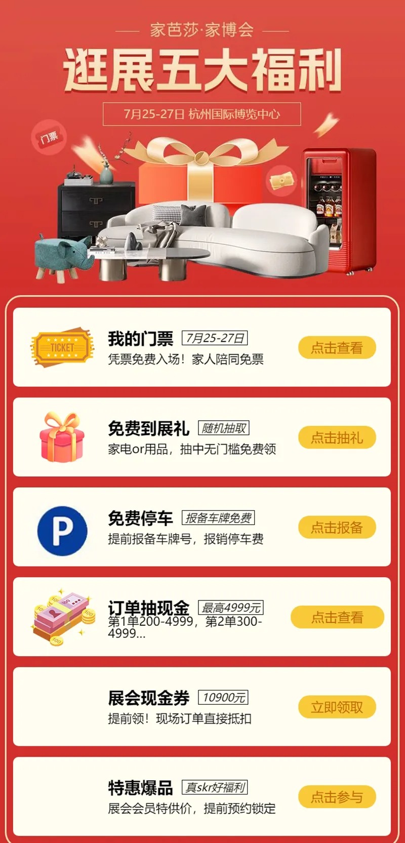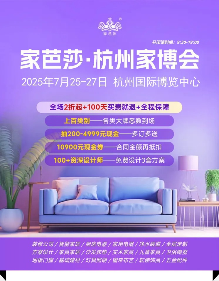 2025夏季杭州家博会将于7月25-27日在杭州国际博览中心举行,同期通馆将举办杭州婚博会。本届参展品牌有卡萨帝/海尔、老板、方太、西门子、安吉尔、3M净水器、东芝、松下、约克、COLMO/小天鹅、林内、创维、芝华仕沙发、慕思凯奇、兔宝宝全屋、梦百合、席梦思、喜临门、箭牌卫浴、摩恩卫浴、TOTO 卫浴、都都装饰、中博美装环保整装等...2天亲临展会现场“货比三家”从筹婚到装修你需要的一切都能在此一站购全