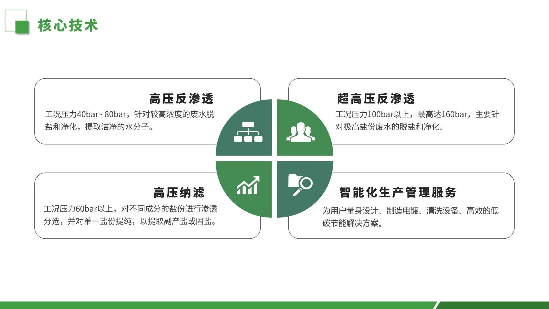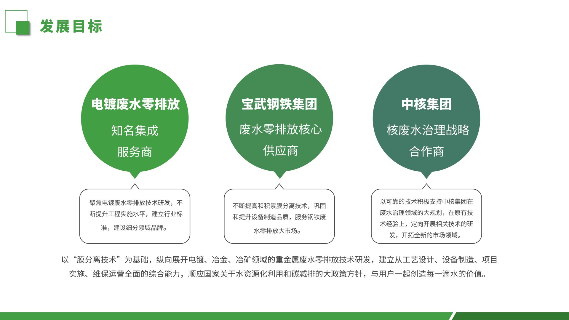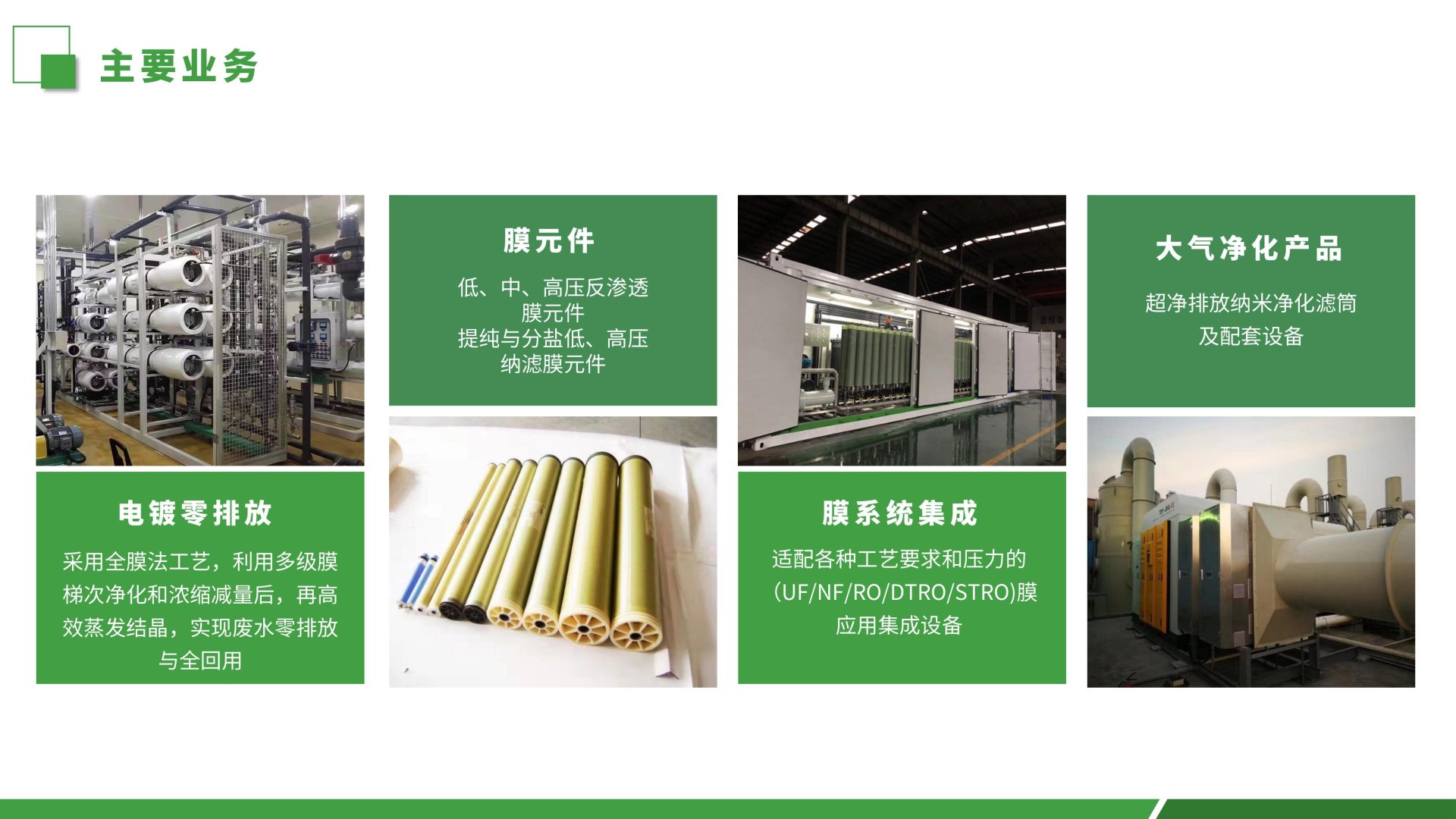 利用“特种分离技术”为客户提供水资源回用(近零排)系统、分离膜元件、电镀设备、相关配套服务的科技型企业综合型服务商