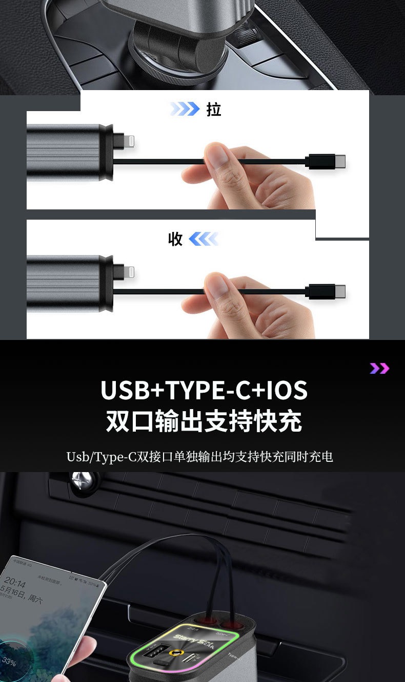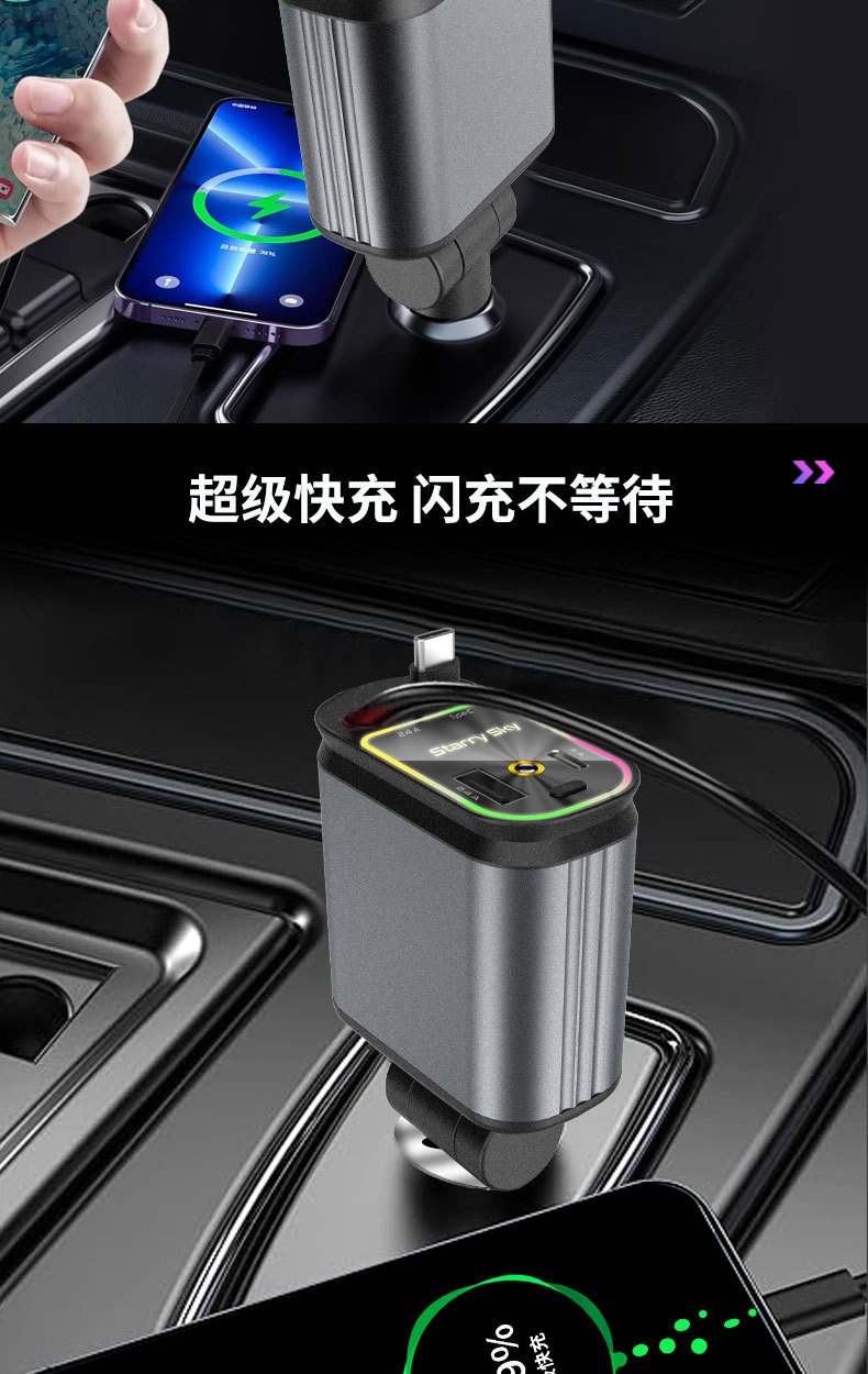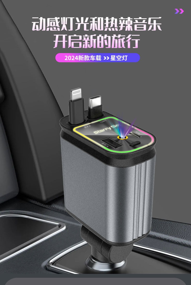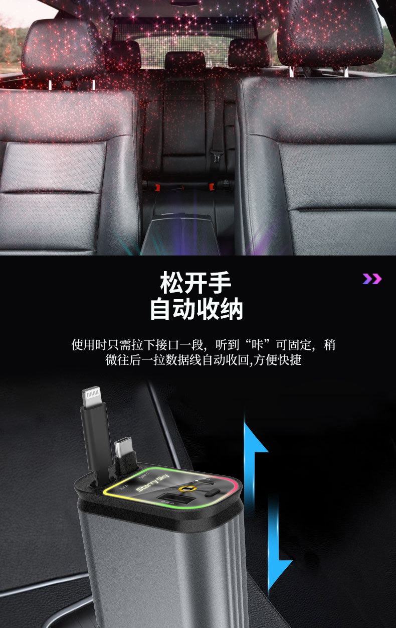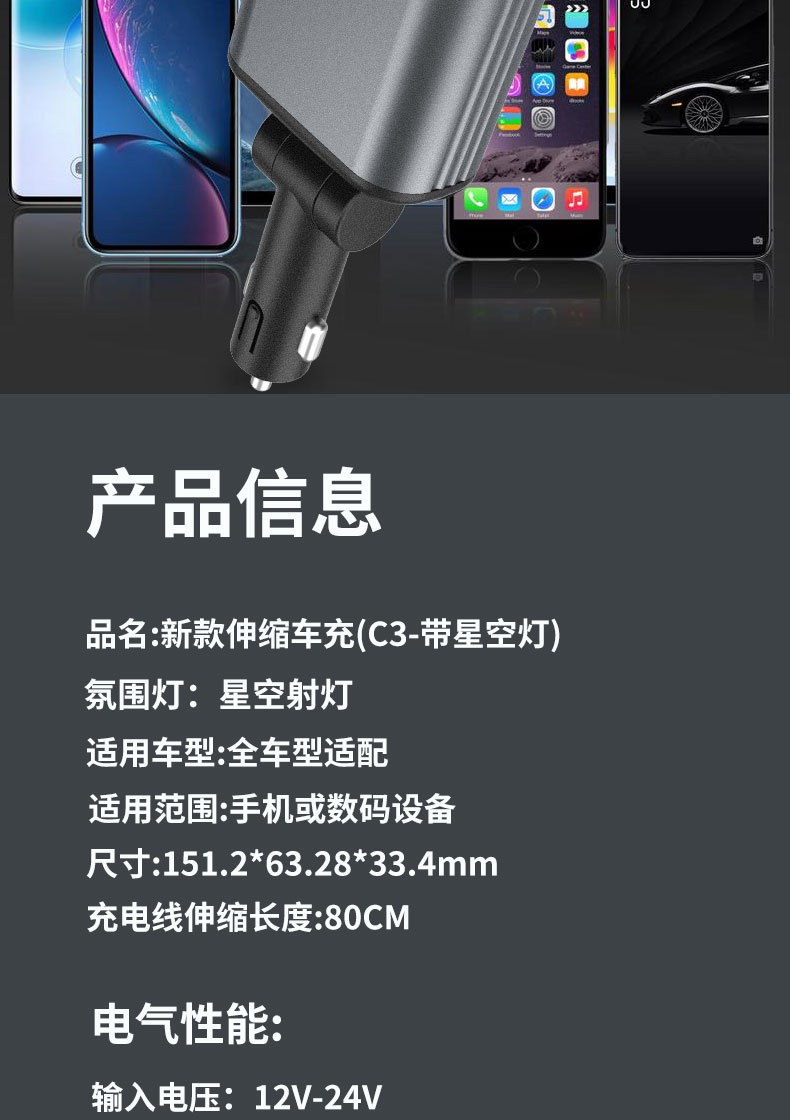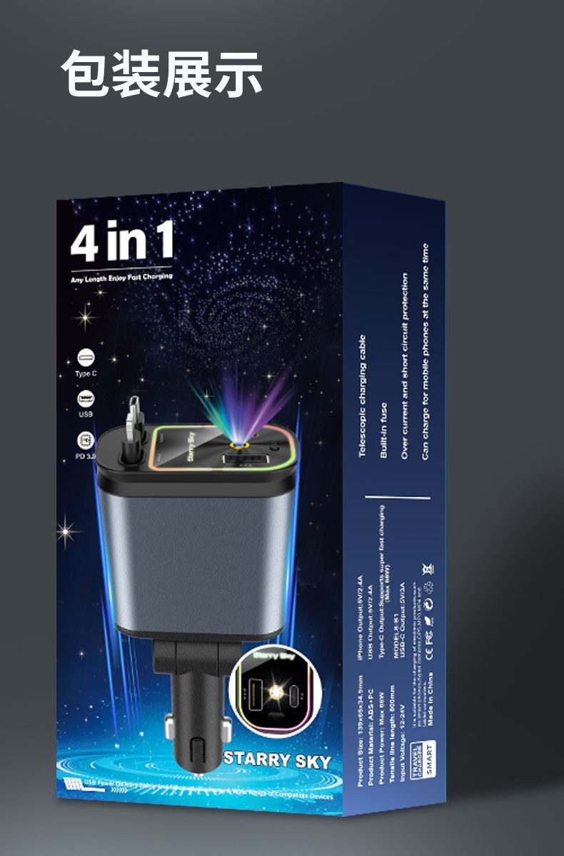 跨境C3车载手机充电器66W超级快充PD带星空顶投影灯四合一伸缩线B