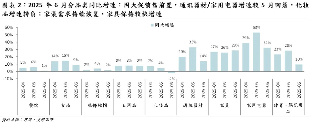 其中4-6月分别增6.1%/8.2%/4.7%。分品类看,6月,因大促销售前置,通讯器材/家用电器增速较5月回落,分别同比增14%/32%,化妆品增速转负;家装需求持续恢复,家具保持较快增速,同比增29%。邮政局预计上半年快递业务量同比增约19%,异地业务持续增加贡献增量。